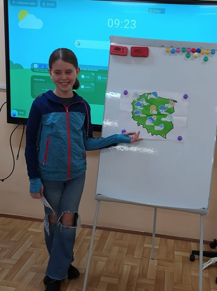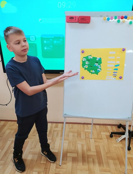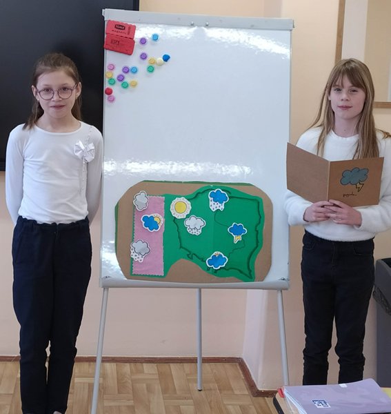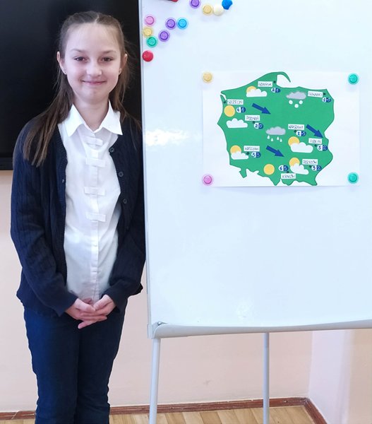 Umieścili na niej symbole zjawisk atmosferycznych takich jak: opady, temperatura, ciśnienie, zachmurzenie, kierunek wiatru. Następnie wcielili się w prezenterów pogody i przedstawili przed klasą swoją prognozę. Wszyscy poradzili sobie fenomenalnie!