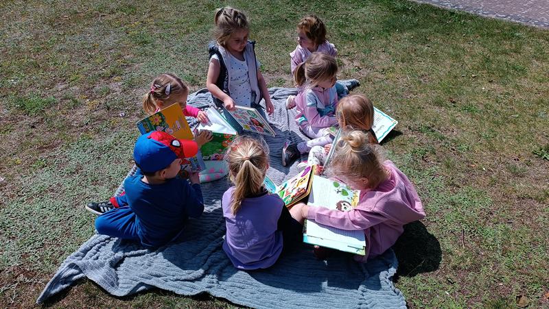 Przedszkolaki, uczniowie kl. I-III oraz uczniowie kl. IV-VIII przynieśli koce, poduszki, swoje ulubione książki i wyszli poza mury szkoły. Piękna pogoda, otoczenie natury sprawiły, że chwile spędzone na świeżym powietrzu z książką mogą być przyjemnością, relaksem, zabawą, a także doskonałą okazją do rozmów.