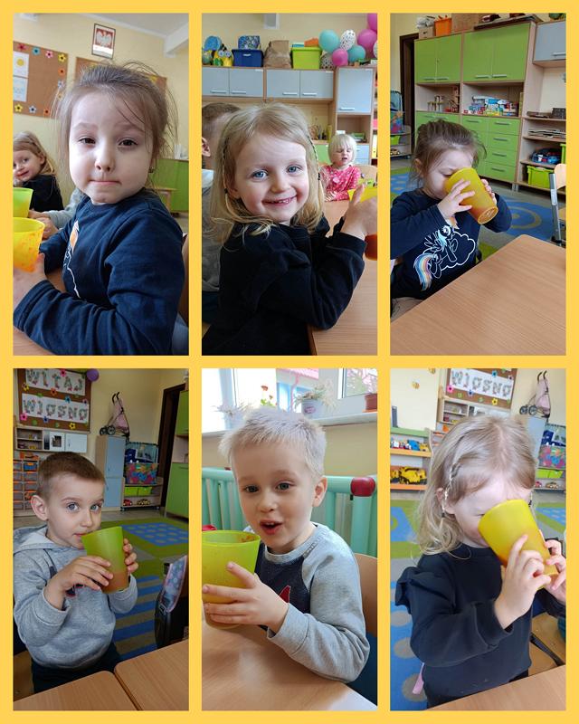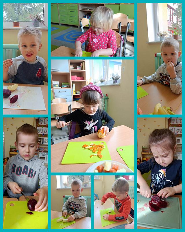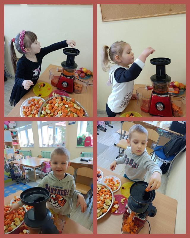 Wiedzą również, że najwięcej witamin mają owoce i warzywa. Z myślą o pysznych witaminach dzieci zrobiły zdrowy sok z marchewki, jabłka, pomarańczy oraz buraka. Dzieci z zaangażowaniem przystąpiły do mycia owoców, następnie ich obierania i krojenia. Największą radość sprawiło dzieciom samodzielne wkładanie wcześniej przygotowanych owoców do wyciskarki. Oczywiście zanim zaczęliśmy pracę, przedszkolaki zapoznały się z urządzeniem do robienia soku, jego działaniem oraz utrwaliły podstawowe zasady higieny i bezpieczeństwa. Po skończonej pracy dzieci bardzo chętnie piły samodzielnie przygotowany sok.