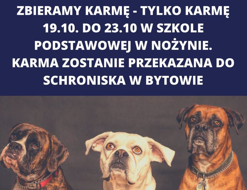 Dużymi krokami zbliża się zima. W chłodne dni nie możemy zapomnieć o naszych kochanych zwierzakach. Wolontariusze naszej szkoły ogłaszają zbiórkę karmy i innych rzeczy dla psów przebywających w schronisku dla zwierząt.