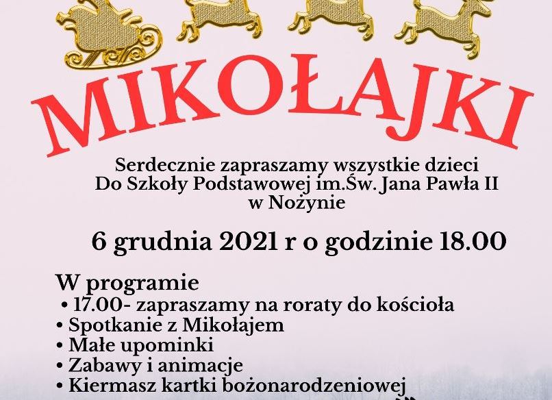 Dyrektor, Grono Pedagogiczne zapraszają wszystkie dzieci w poniedziałek, 6 grudnia 2021roku do Szkoły Podstawowej im. Św. Jana Pawła II w Nożynie. Mikołajki rozpoczną się o godzinie 18 00.