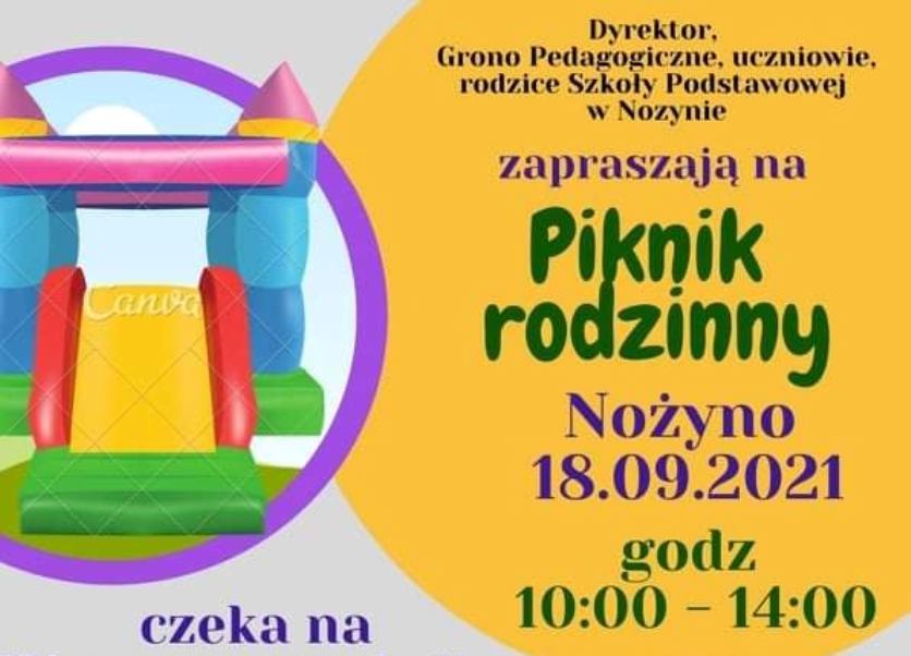 Dyrektor, Grono Pedagogiczne, uczniowie, rodzice Szkoły Podstawowej w Nożynie zapraszają na Piknik Rodzinny, który odbędzie się 18.09.2021 roku o godzinie 9.00 w Nożynie.